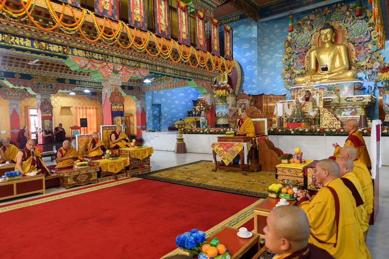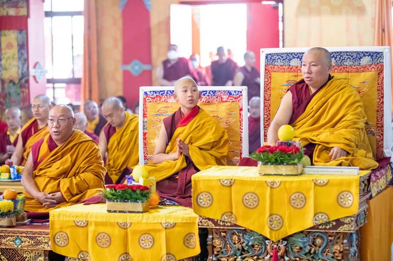 9. Bokar Yangsi Rinpoche sat between HE Zurmang Gharwang Rinpoche and his tutor, Khenpo Lodoe Donyo Rinpoche.