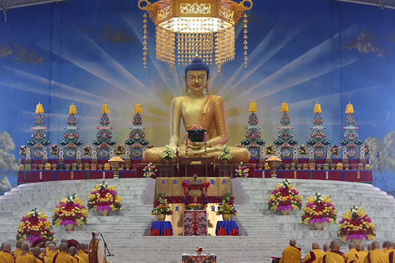 Spanning the stage, the eight great tormas at the 35th Kagyu Monlam celebrate the Eight Great Chariots of the Practice Lineages — the eight principal traditions which brought the Buddhist teachings from India to Tibet: Nyingma, Kadampa, Lamdre, Marpa Kagyu, Shangpa Kagyu, Shiche, Jodruk [Six-Branched Application] and Nyendrub. These traditions encompass the major schools and lineages within Tibet and were particularly important to the Ri-mé movement and to Jamgön Kongtrül Lodrö Thayé when he compiled his work The Five Great Treasures.