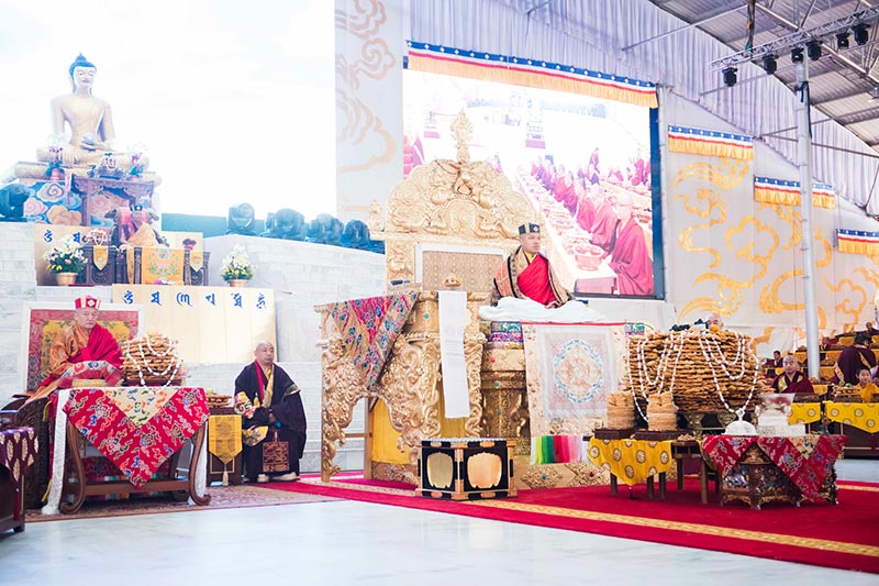 The decoration of the Pavilion was much simpler as the focus shifted to the performances on the stage where rows of traditional benches were set up, like an unfolded fan, for the staff to be seated. His Holiness the Gyalwang Karmapa  was seated  in the center of the stage,  beside him sat H.E. Goshir Gyaltsap Rinpoche. To the left of the stage sat the senior lay staff of the labrang  and the Monlam, extending into the left wing with the remaining permanent lay Monlam staff. Rinpoches, tulkus and khenpos sat on the right side of the stage; behind them, the high-ranking monks from different monasteries sat on the tiers of the right wing.