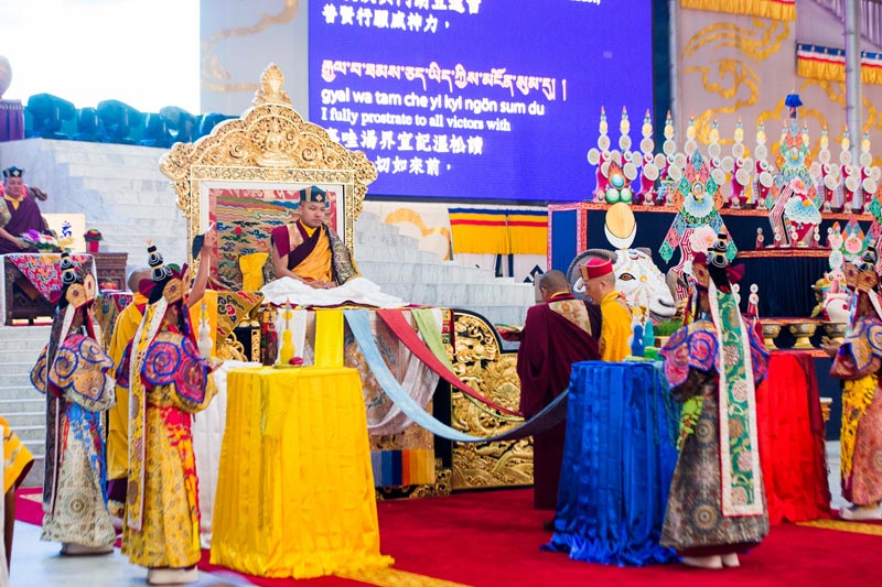 The mandala of giving thanks was followed by a long line of offerings from the Kagyu Monlam Committee. Tashi prayers followed to spread the goodness and benefits of the practice to all parts of the universe: “May all be auspicious through the body, speech, and mind of the Victorious Ones.” Holding fragrant incense, Gyaltsap Rinpoche escorted the Karmapa off the stage for a short break before the public audience.