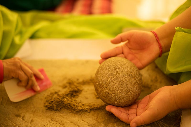 This was done by hand using traditional methods: a large round stone was used on a stone surface. It was physically demanding work and many nuns suffered blisters during the nine days it took to prepare all the ingredients.