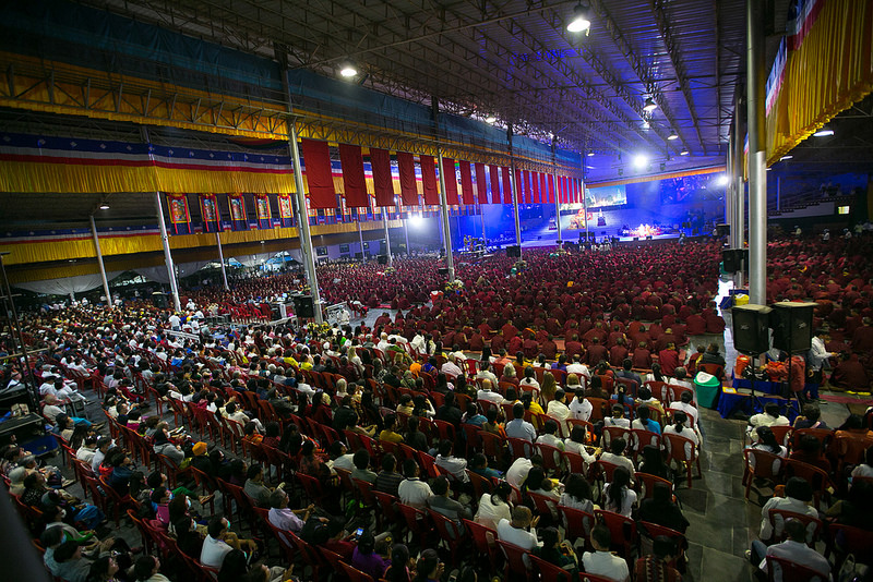 Golden lights beamed down upon the Karmapa, lending an air of majesty to the setting.