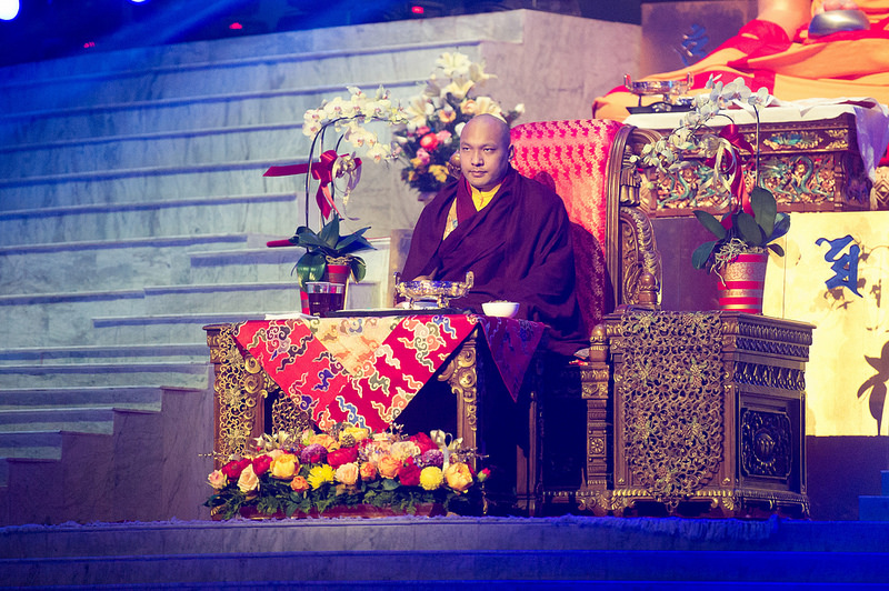 The 17th Gyalwang Karmapa took his seat on a low throne with a Buddha statue above him.