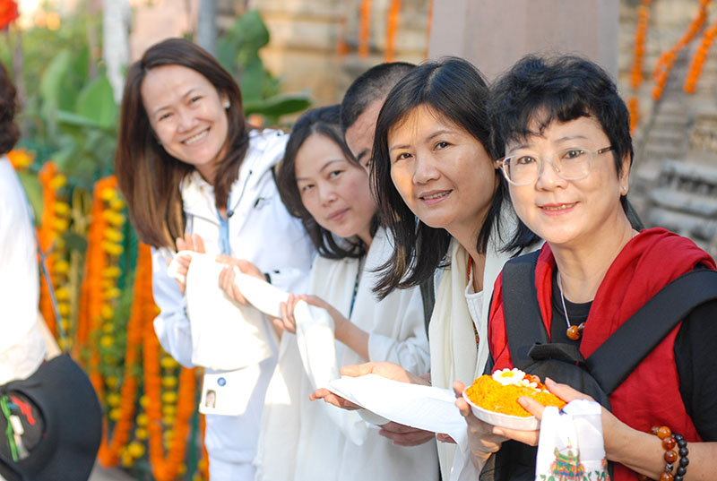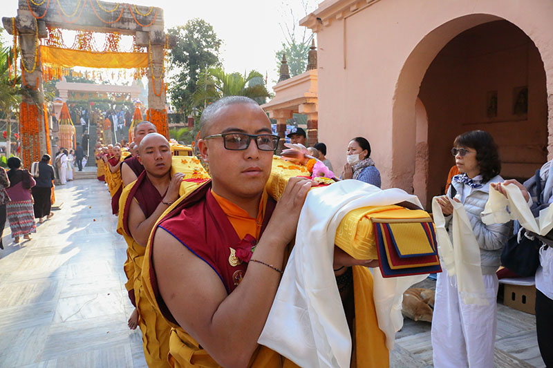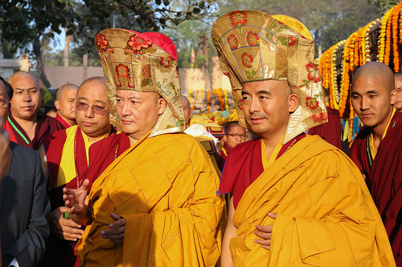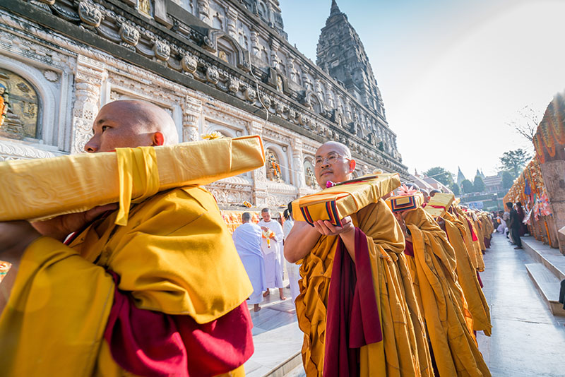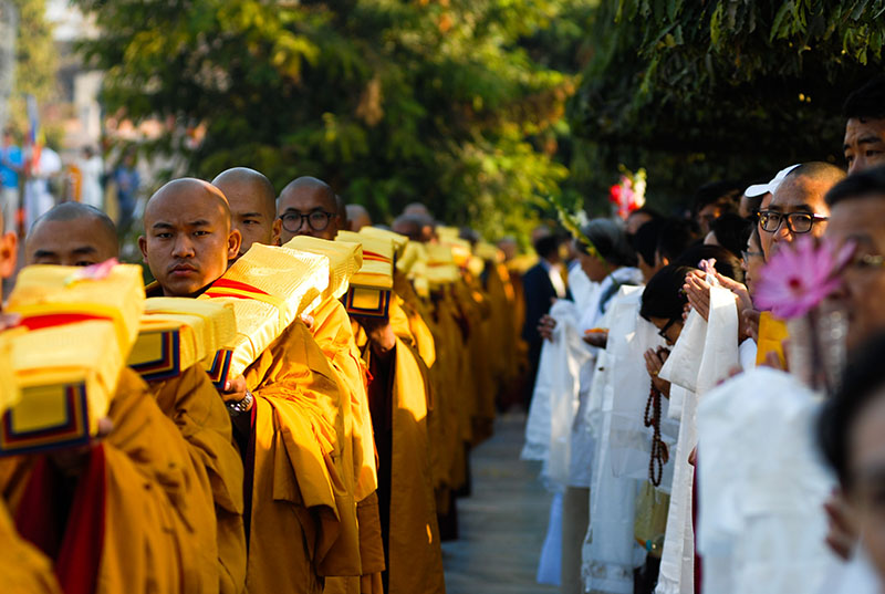 Members of the Sangha processed with volumes of the Kangyur, the words of the Buddha, in circumambulation around the Mahabodhi Temple on Chotrul Duchen. Monastic and lay devotees encircled the upper ring of the temple with white and yellows katas draped in offering. Many carried pink lotuses and others offered yellow, white and orange carnations.