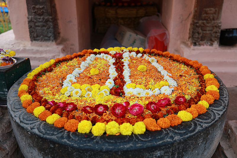 3. Footprints of the Buddha made of marigolds and roses at the Mahabodhi Stupa