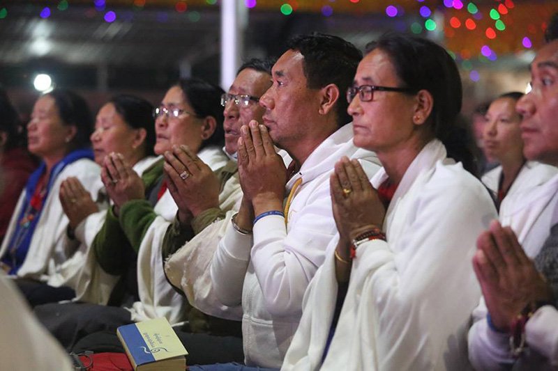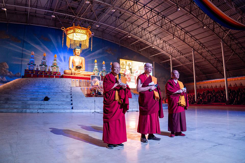 1. On the evening of the full moon, participants reflect on the the golden Buddha image in anticipation of the special address and heart-advice of His Holiness Gyalwang Karmapa.