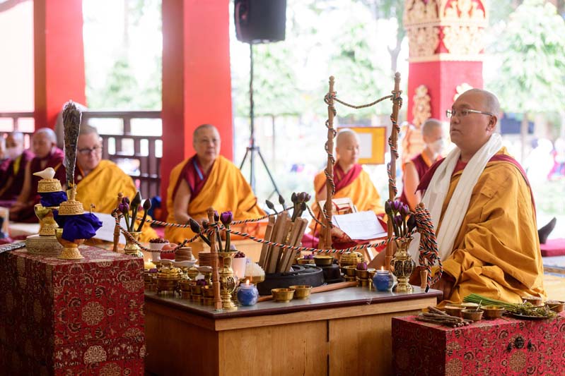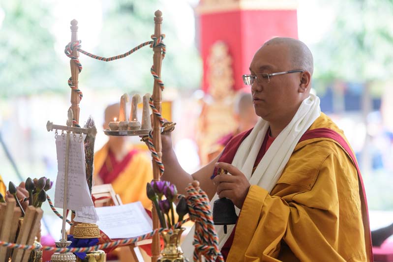 1. Andzin Rinpoche officiates at the ritual on the portico outside Tergar Shrine Room.