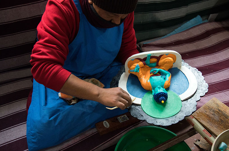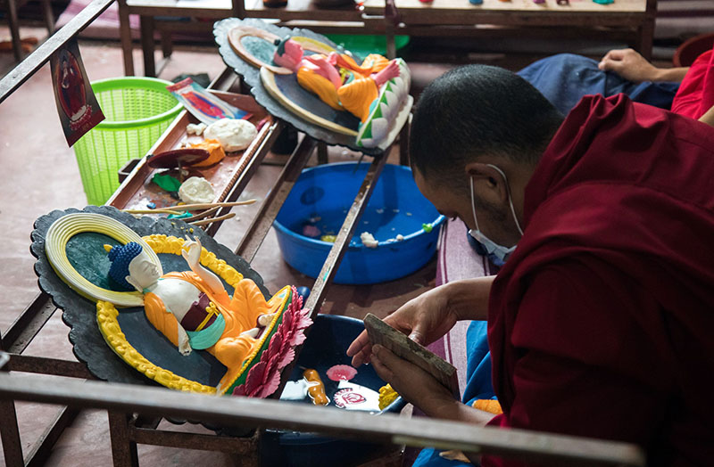 2. A monk carefully sculpts the lotus throne of Buddha.