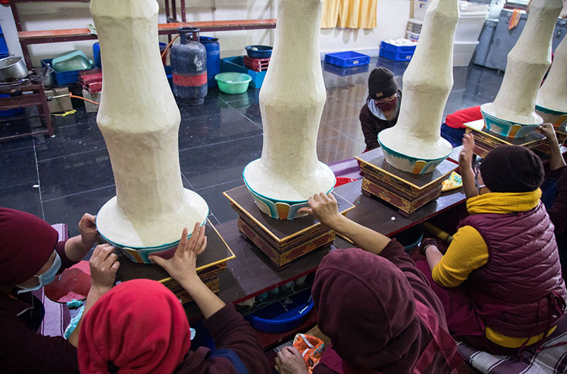 12. The shalzes are mounted on decorated wooden stands. These nuns are working on the decorative bases of the shalzes.