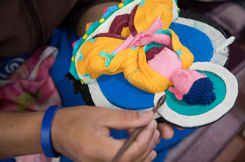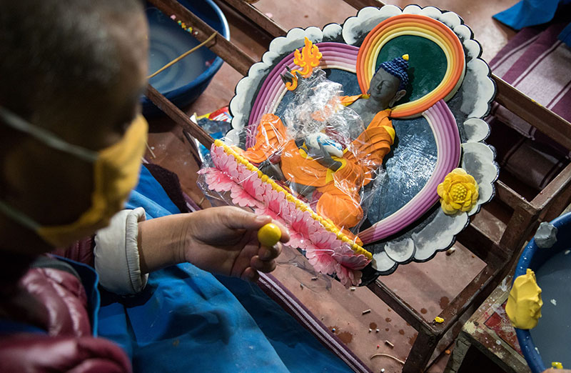 1. A junior torma maker sculpts a Buddha.