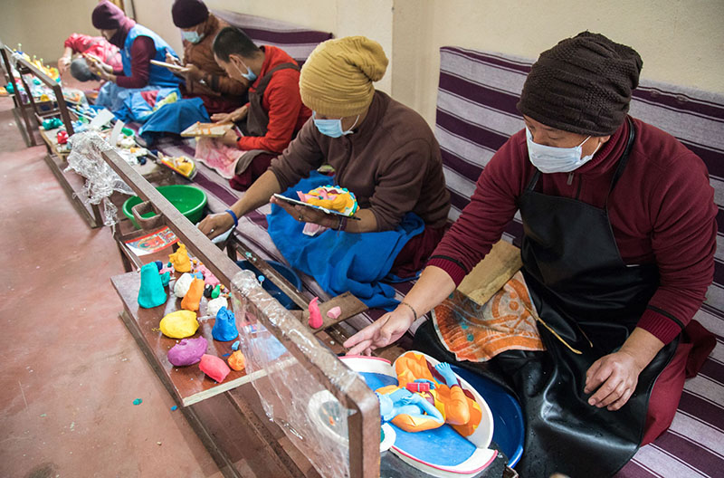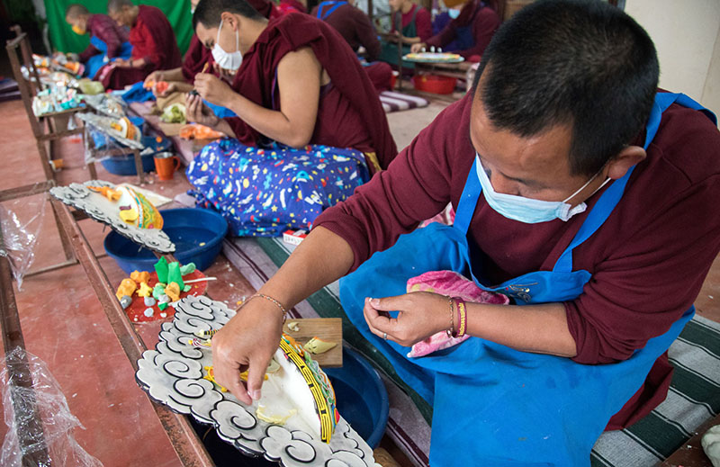 Each year, Kagyupa International Monlam Trust supports the work of the torma makers who gather to create the butter sculptures for the Kagyu Monlam Chenmo and any rituals which will take place. The team in 2020 comprises 14 nuns and 53 monks, a mix of highly skilled and experienced senior torma makers and less-experienced junior ones.