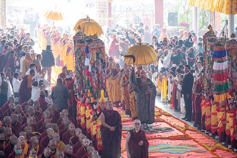 ཕྱི་ལོ་ ༢༠༢༠ ཟླ་ ༢ ཚེས་ ༧ ཉིན་སྔ་དྲོ་དུས་ཚོད་བདུན་པའི་ཐོག་བསོད་སྙོམས་རྒྱུ་འབུལ་གྱི་མཛད་རིམ་དབུ་ཚུགས་ཤིང་། སྤྱིར་བསོད་སྙོམས་རྒྱུ་འབུལ་གྱི་མཛད་རིམ་ནི་སྔ་ལོ་ལྟར་བདག་ཅག་གི་སྟོན་པ་གཙོ་འཁོར་གསུམ་གྱིས་དབུས་ཐུབ་པས་བཀའ་ བསྒོས་ཤིང་བསྟན་པའི་རྒྱལ་མཚན་འཛིན་པའི་འཕགས་པའི་གནས་བརྟན་ཆེན་པོ་ཡན་ལག་འབྱུང་དང་། མ་ཕམ་པ་དང་། ནགས་ན་གནས་པ་ལ་སོགས་གནས་བརྟན་ཆེན་པོ་བཅུ་དྲུག་གི་ཞལ་འབག་དང་ཟ་འོག་ལས་གྲུབ་པའི་ན་བཟའ་ལོ་ཤས་སྔོན་ནས་བཅོས་ པ་དེ་བཞིན་མནབས་ནས་གནས་བརྟན་རེ་རེའི་མཇུག་ཏུ་ཞལ་ཏ་བ་རེ་དང་གནས་བརྟན་སོ་སོའི་དགྲ་བཅོམ་གྱི་འཁོར་གྲངས་དང་ མཐུན་པ་ མཚོན་ཕྱིར་དགྲ་བཅོམ་བརྒྱ་ཕྲག་རེར་དགེ་སློང་རེ་རེའི་གྲངས་ཀྱིས་མཚོན་པར་བྱས་ཏེ་གནས་བརྟན་རང་རང་གི་དགྲ་བཅོམ་གྱི་འཁོར་ གྲངས་དང་མཐུན་པའི་བར་དུ་གནས་བརྟན་རེ་སྟེ་ཡོངས་བསྡོམས་དགེ་སློང་བརྒྱ་དང་བདུན་ཅུ་ཙམ་དང་ཕྱི་ནང་གི་དགེ་སློང་མ་བཅུ་ཕྲག་ ལ་ཉེ་བ་རྣམས་རེ་རེ་བཞིན་བསོད་སྙོམས་ལ་ཕེབས་སྐབས་སྤྱོད་ལམ་དུལ་ཞིང་གོམ་སྟབས་བུལ་བ་སྔོན་བདག་ཅག་གི་སྟོན་པ་ཐུགས་ རྗེ་ཅན་འཇིག་རྟེན་དུ་འཚོ་ཞིང་གཞེས་པའི་སྐབས་སུ་ཡང་དགེ་སློང་རྣམས་བསོད་སྙོམས་ལ་རྒྱུ་ཚུལ་འདི་ལྟ་བུ་ཞིག་ཡིན་ཤས་ཆེ་སྙམ་ པའི་དད་གུས་རང་དབང་མེད་པར་སྐྱེ་ཞིང་། འདྲེན་བྱེད་མཆི་མས་བརླན་ཞིང་ལུས་ཀྱི་བ་སྤུ་དབང་མེད་དུ་ལྡང་བར་བྱེད།
