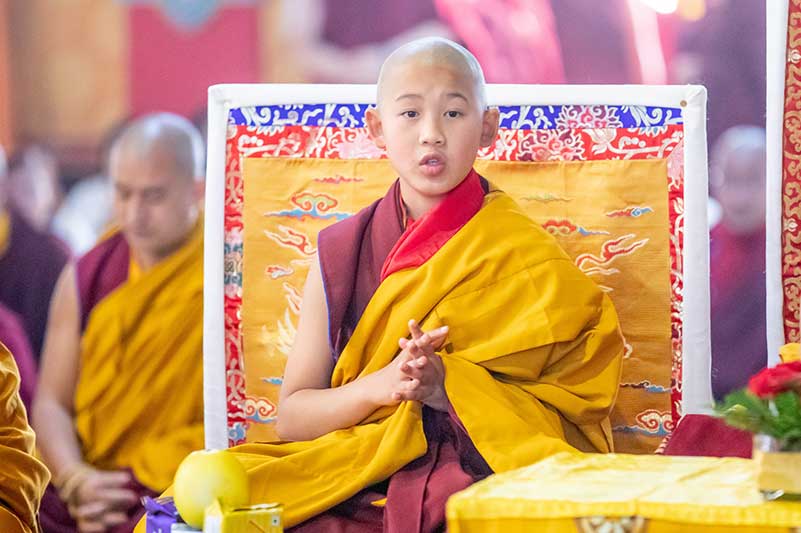 དེ་རིང་ཞོགས་པ་ཆུ་ཚོད་ལྔ་པའི་ཐོག་འབོ་དཀར་མཁན་རིན་པོ་ཆེ་བློ་གྲོས་དོན་ཡོད་དང་སྐྱབས་རྗེ་འབོ་དཀར་ཆུང་སྲིད་རིན་པོ་རྣམ་པ་སྐུ་འཁོར་མཆོད་རྟེན་ནང་དུ་ཕེབས་ཏེ་འཛམ་གླིང་ས་ཡི་ལྟེ་བ་གནས་མཆོག་གྱུར་མ་ག་དྷའི་མཆོད་སྡོང་གི་ནང་རྟེན་སྟོན་པའི་སྐུ་བརྙན་མཐོང་གྲོལ་ཡིད་བཞིན་ནོར་བུ་ལ་ན་བཟའ་དང་སྐུ་དྲུང་དུ་ལྷུང་བཟེད་འབུལ་རྒྱུའི་གྲ་སྒྲིག་དང་བསྟུན་༸སྐྱབས་རྗེ་གཽ་ཤྲཱི་རྒྱལ་ཚབ་རིན་པོ་མཆོག་དང་། སྐྱབས་རྗེ་ཟུར་མང་གར་དབང་རིན་པོ་ཆེ། སྐྱབས་རྗེ་ཡོངས་དགེ་མི་འགྱུར་རིན་པོ་ཆེ་རྣམ་པའི་སྐུ་འཁོར་དང་བཅས་ཆེད་དུ་ཆིབས་བསྒྱུར་བསྐྱངས། སྟོན་པ་ཡང་དག་པ་རྫོགས་པའི་སངས་རྒྱས་ཀྱི་སྐུ་བརྙན་མཐོང་གྲོལ་རིན་པོ་ཆེ་ལ་རེག་ན་འཇམ་པའི་ན་བཟའ་སྒྲོན་འབུལ་དང་། ཚ་གྲང་གི་ནད་རིགས་འཇོམས་པའི་ཨ་རུ། བ་རུ། སྐྱུ་རུ་སོགས་སྨན་སྣ་ཚོགས་དང་། མྱོང་ན་རོ་བརྒྱ་ལྡན་པའི་ཤོང་ཐོག་སྣ་ཚོགས་ཀྱིས་ལྷུང་བཟེད་ཕྱུར་བུར་གཏམས་ཏེ་ཕུལ། དེ་རྗེས་སྟོན་མཆོག་དོན་ཀུན་གྲུབ་པས་སྲོད་ལ་བདུད་བཏུལ་གུང་ལ་མཉམ་པར་གཞག་ཐོ་རངས་ལ་མངོན་པར་རྫོགས་པ་སངས་རྒྱས་པའི་གནས་བྱང་ཆུབ་སྙིང་པོར་ལྗང་མདོག་གི་ལོ་འདབ་རབ་ཏུ་རྒྱས་པའི་བྱང་ཆུབ་ལྗོན་ཤིང་དྲུང་། ས་གཞི་གཙང་ཞིང་ཡིད་དུ་འོང་བའི་ཐོག་མཛེས་སྡུག་རྣམ་པར་བཀྲ་བའི་མེ་ཏོག་གིས་བརྒྱན་པའི་མཆོད་ཁྲིའི་ཐོག་སྐུ་གསུང་ཐུགས་རྟེན་གྱི་མཚོན་པའི་མཆོད་པའི་བྱེ་བྲག་སྣ་ཚོགས་བཤམས་པའི་མདུན་དུ་སྐྱབས་རྗེ་རྒྱལ་བའི་རྒྱལ་ཚབ་རིན་པོ་མཆོག་བཞུགས་ཁྲིར་བཞུགས་མཛད་ཅིང་། གཡས་གཡོན་ནས་རིམ་པར་སྐྱབས་རྗེ་གར་དབང་རིན་པོ་ཆེ་དང་ཡོངས་དགེ་མི་འགྱུར་རིན་པོ་རྣམ་པ་དབུས་པས་འདུས་མང་བཞུགས་ཟིན་རྗེས་སྐྱབས་རྗེ་འབོ་དཀར་ཡང་སྲིད་རིན་པོ་ཆེ་ནས་སྒྲུབ་བརྒྱུད་བསྟན་པའི་གསལ་བྱེད་སྐྱབས་མགོན་རྒྱལ་བའི་རྒྱལ་ཚབ་མཆོག་ལ་མནྜལ་སྐུ་གསུང་ཐུགས་རྟེན་འདེགས་འབུལ་ཞུས། དབུ་མཛད་ནས་ཐུབ་བསྟོད་དང་སོ་ཐར་སྒོམ་རྒྱུན་གྱི་གསོལ་འདེབས་གསུངས། སྐྱབས་རྗེ་རྒྱལ་ཚབ་ཚབ་རིན་པོ་ཆེ་མཆོག་ནས་འབོ་དཀར་ཆུང་སྲིད་རིན་པོ་མཆོག་ལ་བར་མ་རབ་བྱུང་གི་སྡོམ་པ་སྩལ་ཞིང་རིམ་པར་དབུ་སྐྲའི་གཙུག་ཕུད་བཞེས། ཆོས་གོས་དང་ཤམ་ཐབས་གདིང་བ་བཅས་ལ་བྱིན་རླབས་མཛད་རྗེས་ཁྱིམ་པའི་རྟགས་འདོར་ཅིང་རབ་བྱུང་གི་རྟགས་གཟན་ཤམ་དང་ཆོས་གོས་གསོལ་བཞེས་མཛད་རྗེས་སྐྱབས་རྗེ་འབོ་དཀར་ཆུང་སྲིད་རིན་པོ་ཆེ་ལ་༼༽མཚན་གནང་མཛད། རྒྱལ་དབང་བཅུ་བདུན་པ་མཆོག་གིས་གནང་བའི་མགུལ་དར་དང་སྒྲོལ་མའི་སྐུ་བརྙན། སྐྱབས་རྗེ་དྲུང་གཽ་ཤྲཱི་རྒྱལ་ཚབ་རིན་པོ་ཆེ་མཆོག་ནས་སྟོན་རྫོགས་པའི་སངས་རྒྱས་ཀྱི་སྐུ་སྤུས་ལེགས་ཤིག་བཅས་འབོ་དཀར་ཡང་སྲིད་རིན་པོ་ལ་གནང་། མཐར་བཀྲ་ཤིས་བརྒྱད་པ་སོགས་