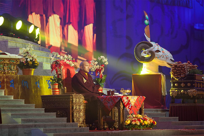 སྤྱི་ལོ་༢༠༡༧ཟླ་༢ཚེས་༢༨བོད་མེ་བྱ་ལོ་ཟླ་བ་དང་པོའི་ཚེས་གཉིས་ཀྱི་དགོང་མོར་༸རྒྱལ་དབང་ཀརྨ་པ་སྐུ་ཡི་ཕྲེང་བ་འཛིན་པ་བཅུ་བདུན་པ་ཆེན་པོ་མཆོག་གི་དབུས་པས་སྐྱབས་རྗེ་རྒྱབ་ཚབ་རིན་པོ་ཆེ་དང་འདུས་མང་སེར་སྐྱ་ཡོངས་བཞུགས་གྲལ་དུ་འཁོད་ཟིན་རྗེས་རྗེ་དུས་གསུམ་མཁྱེན་པའི་ཐུགས་དམ་ལྔ་ཚན་ལྔ་ལས་བདེ་མཆོག་ལྷ་ལྔའི་མངོན་པར་རྟོགས་པ་རྗེ་ཀརྨ་པ་བརྒྱད་པས་མཛད་པའི་ཚོགས་འཁོར་དང་འབྲེལ་བའི་ཕྱི་དྲོའི་གསོལ་ཚིགས་དང་སྲོལ་རྒྱུན་གླུ་གར་གྱི་མཆོད་བསྟོད་ཕུལ།དེ་ཡང་གླུ་གར་གྱི་མཆོད་བསྟོད་ཕུལ་བའི་དགོས་པ་ནི་ཧི་མཱ་ལ་ཡའི་རི་རྒྱུད་ཀྱི་སྲོལ་རྒྱུན་རིག་གཞུང་མི་ཉམས་པ་དང་།གྲུབ་མཐའ་ལ་ཞུགས་མ་ཞུགས་མང་པོ་ཞིག་གིས་མིག་ཡིད་རྣ་བའི་དགའ་སྟོན་ལ་རོལ་ནས་དགའ་སྐྱིད་སྤྲོ་སྣང་གི་མེ་ཏོག་གསར་དུ་བཞད་ཐུབ་པ་དང་། ཆོས་ཕྱོགས་ནས་ཀྱང་བཅོམ་ལྡན་འདས་ཀྱིས་མདོ་ཏིང་ངེ་འཛིན་གྱི་རྒྱལ་པོ་ལས།གླུ་གར་བཟང་པོ་སྣ་ཚོགས་མང་པོ་དང་།།ཡིད་གཙང་བཞད་གད་རོལ་མོ་སྣ་ཚོགས་དང་།།རྟག་པར་མར་མེའི་ཕྲེང་སྡུག་བཟང་པོ་ཡིས།།མཚུངས་པ་མེད་ལ་མཆོད་བཟང་རབ་ཏུ་གྱིས།།ཞེས་གདམས་པ་ལྟར་རྒྱལ་བ་དགྱེས་པའི་མཆོད་སྤྲིན་དུ་གྱུར་གྱི་ཡོད་པ་སོགས་དགོས་ཆེད་དུ་མར་དམིགས་ཏེ་ཐོག་མར་སྐུ་ཞབས་ཤེས་རབ་མཐར་ཕྱིན་དང་དངོས་གྲུབ་ཚེ་རིང་རྣམ་པ་གཉིས་ཀྱིས་བོད་དབྱིན་གཉིས་ཀྱི་སྐད་ཐོག་ནས་སྒར་ཆེན་ལོ་སར་དང་སྲོལ་རྒྱུན་གླུ་གར་དང་འབྲེལ་བའི་ལོ་རྒྱུས་དང་བྱུང་རབས་དགོས་ཆེད་སོགས་མཚམས་སྦྱོར་དང་སྦྱར་ཏེ་ངོ་སྤྲོད་རིམ་གྱིས་གནང་ཞིང་།རྡ་ས་ཟློས་གར་ཚོགས་པ་དང་།འབྲུགའབྲས་ལྗོངས།མོན་པ།ལ་དྭགས་སོགས་ནས་ཕེབས་པའི་གླུ་པ་གླུ་མ་དང་།ཟློས་གར་ཁང་རྣམ་པས་འཁྲབ་གཞས་དང་རྐྱང་གཞས་བར་བར་དུ་བོད་ནས་སྐད་གྲགས་ཅན་གྱི་གླུ་པ་གླུ་མ་ཁག་གཅིག་ནས་༸རྒྱལ་དབང་མཆོག་ལ་བསྟོད་གཞས་འོད་སྡེར་བོད་ནས་གསར་དུ་འབྱོར་བ་དང་སྦྱར་ནས་འདུས་མང་ཡོངས་ལ་གཟིགས་འབུལ་ཞུས་ཟིན་རྗེས་སྐུ་ཞབས་རྣམ་པ་གཉིས་ནས་བཀྲ་ཤིས་བསྔོ་སྨོན་གྱིས་མཇུག་བསྡུས།དེ་རྗེས་དབུ་མཛད་རྣམ་པས་བདེ་མཆོག་ཚོགས་འཁོར་གྱི་མཇུག་བཀྲ་ཤིས་བསྔོ་སྨོན་གྱིས་བརྒྱན་ཏེ་མཛད་སྒོ་མཇུག་ལེགས་པར་གྲུབ་བོ།།