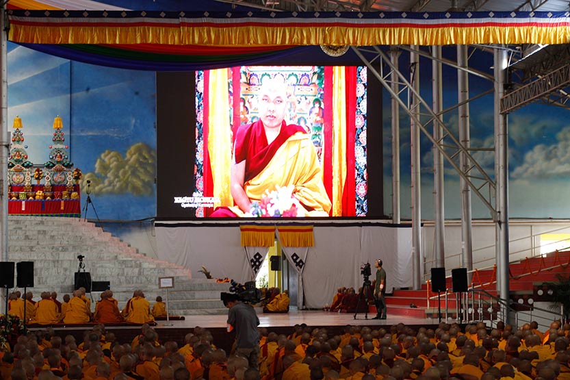 སྤྱི་ལོ་ ༢༠༡༨ ཟླ་ ༢ ཚེས་ ༢༨ ཉིན་སྔ་དྲོའི་ཚོགས་ཐུན་ཕྱི་མ་འཚོག་སྐབས་སྤོས་རྒྱ་བསུ་མ་དང་བཅས་༸རྒྱལ་དབང་མཆོག་གི་སྐུ་པར་མཐོང་གྲོལ་བཞུགས་ཁྲིའི་ཐོག་གདན་དྲངས་ཏེ་མཎྜལ་རྟེན་གསུམ་སོགས་འདེགས་འབུལ་ཞུས་རྗེས་རྗེ་བདུན་པ་ཆོས་གྲགས་རྒྱ་མཚོས་མཛད་པའི་རྒྱལ་བའི་གསུང་རབ་མངོན་མཐོ་དང་ངེས་ལེགས་ཐེག་པ་གསུམ་གྱི་ལམ། རྒྱུའི་ཐེག་པ་གཙོ་བོར་གྱུར་པའི་བརྒྱུད་པའི་རིམ་པ་རྣམས་ལ་མདོར་བསྡུས་ཏེ་གསོལ་བ་འདེབས་པ་དབྱངས་སུ་གྱེར་མཐར་༸རྒྱལ་དབང་མཆོག་གི་བཀའ་ཆོས་སྔ་མའི་འཕྲོ་མུ་མཐུད་སྩལ་དོན། དེ་རིང་ཉིན་གསུམ་པའི་གསུང་ཆོས་ལ་ཐུག་ཡོད་རེད། དེའི་ཐོག་ཏུ་ཕེབས་པའི་དྲུང་གཽ་ཤྲི་རྒྱལ་ཚབ་རིན་པོ་ཆེ་དང་། སྐྱབས་རྗེ་ཡོངས་དགེ་མི་འགྱུར་རིན་པོ་ཆེ་དབུས་པས་བླ་སྤྲུལ་མཁན་པོ་དགེ་བའི་བཤེས་གཉེན་རྣམ་པ་དང་། དགོན་སྡེ་ཁག་ནས་ཕེབས་པའི་གྲྭ་བཙུན་རྣམ་པ། ཕྱོགས་མཐའ་ཁག་ནས་ཕེབས་པའི་དད་ལྡན་ཆོས་ཞུ་བ་ཡོངས་ལ་ཐོག་མར་འཚམས་འདྲི་ཞུ་རྒྱུ་ཡིན།