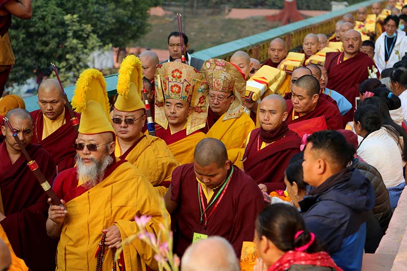 ཕྱི་ལོ་ ༢༠༡༩ ཟླ་ ༡ ཚེས་ ༡༨ ཉིན་གྱི་སྔ་དྲོ་ཆུ་ཚོད་བརྒྱད་པའི་ཐོག་༸སྐྱབས་རྗེ་རྒྱལ་བའི་རྒྱལ་ཚབ་རིན་པོ་ཆེ་མཆོག་དང་། སྐྱབས་རྗེ་མི་འགྱུར་རིན་པོ་ཆེ་རྣམ་གཉིས་སྨོན་ལམ་ཆོས་ར་ནས་ཆིབས་འཕྲུལ་ཐོག་རྡོར་གདན་མཆོད་རྟེན་ཆེན་མོར་ཆིབས་བསྒྱུར་ བསྐྱངས་སྐབས་རྡོར་གདན་བྱང་ཆུབ་མཆོད་རྟེན་འཛིན་སྐྱོང་ཚོགས་པའི་དྲུང་ཆེ་སྐུ་ཞབས་སྣང་མཛད་རྡོ་རྗེ་ལགས་སོགས་གནད་ ཡོད་མི་སྣ་རྣམས་ནས་ནས་བྱོན་བསུའི་མཇལ་དར་ཕུལ་བ་ཕྱིར་སློག་མཛད་རྟིང་བཀའ་འགྱུར་ཆོས་སྐོར་གྱི་སྟ་གོན་མཛད་ཡུལ་དུ་ གཟིགས་ཞིབ་ལེགས་པར་བསྐྱངས།