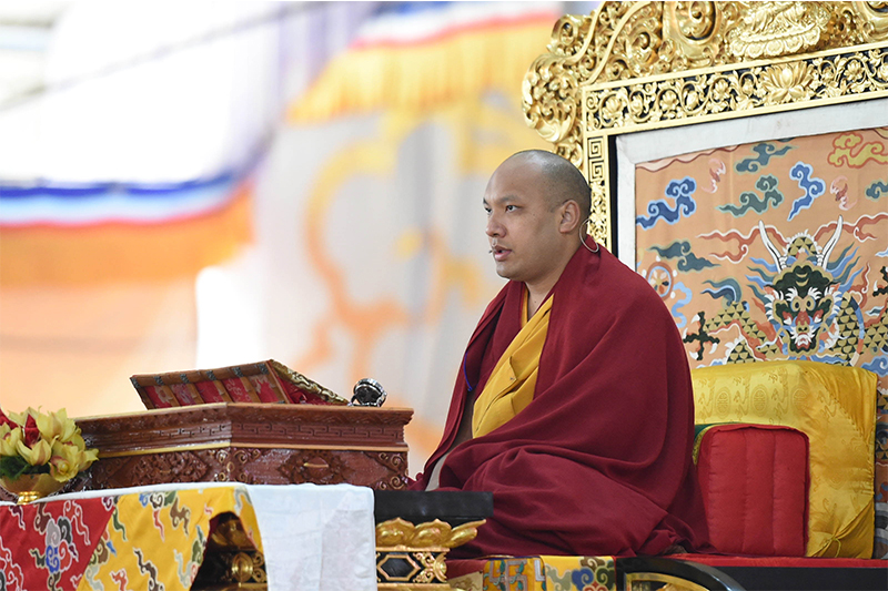 དེ་རིང་བཀའ་བརྒྱུད་སྨོན་གྱི་ཉིན་དང་པོ་ཆགས་ཀྱི་ཡོད། དེ་ཡང་ཚང་མས་མཁྱེན་གསལ་ལྟར་གནས་མཆོག་འདི་ཉིད་ནི་རྩ་ཆེན་ཞིག་ཡིན་པ་དང་། ནང་པ་སངས་རྒྱས་པའི་གནས་ཆེ་ཤོས་ཤིག་ཀྱང་ཡིན། དེ་ལ་ཆོས་བརྒྱུད་ཁག་ཀྱི་སྨོན་ལམ་ཡང་མང་པོ་ཚོགས་ཀྱི་ཡོད། གནས་དེར་བཀའ་བརྒྱུད་སྨོན་ལམ་དེ་དག་ཚོགས་ནས་ད་བར་ལོ་ངོ་སོ་བཞི་ཕྱིན་ཡོད། སྨོན་ལམ་ཚོགས་དགོས་པ་ནི་སེམས་ཅན་ཀུན་ལ་བདེ་སྐྱིད་འབྱུང་བ་དང་། འཛམ་གླིང་ཞི་བདེ་འབྱུང་བའི་ཆེད་ཡིན། ཞི་བདེ་འབྱུང་བའི་རྩ་བ་ནི་རང་ཉིད་མི་བཟང་པོ་བྱེད་རྒྱུ་དེ་རེད། དེ་འདྲ་ཡིན་སྟབས་ཚང་མས་ཐོག་མར་རང་ཉིད་བཟང་པོར་བཅོས་དགོས། ཐམས་ཅད་ཆོས་བཞིན་ཡོང་དཀའ་ཡང་འབད་བརྩོན་བྱ་དགོས་པ་ཡིན། འབད་བརྩོན་བྱས་ན་མི་འབྱུང་ཅི་ཡང་མེད། སྨོན་ལམ་འདི་ཡང་ལོ་ལ་ལན་གཅིག་ལས་མེད། དེ་ཡང་ཉིན་འགའ་ལས་མེད་སྟབས་ཚང་མས་གང་དྲག་དྲག་གནང་རོགས་ཞེས་བཀའ་སྩལ།