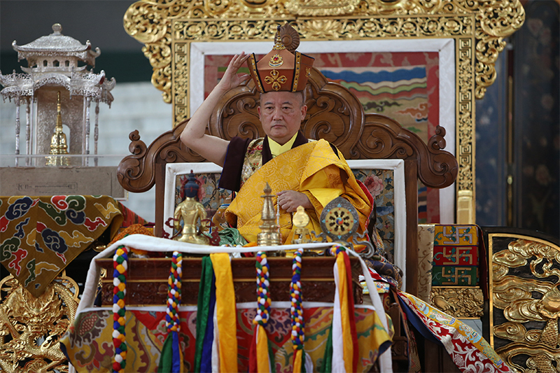 དེ་ནས་དབུ་ཞྭ་མཐོང་གྲོལ་རིན་པོ་ཆེ་དང་སྐྱབས་རྗེ་རྒྱལ་བའི་རྒྱལ་ཚབ་རིན་པོ་ཆེ་མཆོག་ལ་སྔར་༸རྒྱལ་མཆོག་ཡབ་སྲས་རྣམས་ལ་དམིགས་བསལ་གྱི་མཛད་སྒོ་རྣམས་སུ་སེར་སྦྲེངས་རྒྱས་པ་བྱ་ཚུལ་ཡོད་པ་ཇི་བཞིན། མདུན་དུ་དགེ་འདུན་པ་བཞིས་གསེར་གྱི་རྒྱ་གླིང་ཆེས་སྙན་མོ་འབུད་གཏོང་མཛད་ཅིང་དགེ་འདུན་པ་བཞིས་ཕྲ་དང་རི་མོ་སྣ་ཚོགས་པས་སྤྲས་པའི་སྤོས་ཕོར་བཞི་ཕྱག་ཏུ་བསྣམས། གདན་ས་རུམ་བཏེག་གི་ཆོས་ཁྲིམས་པ་ཆེན་པོས་སྤོས་སྣ་དང་བཅས་རིམ་གྱིས་ལེགས་པར་བསུས་ནས་བཞུགས་ཁྲིའི་སྟེང་དུ་གདན་དྲངས་པར་མཛད། དེ་ཚེ་འདུས་པ་ཀུན་ཡིད་རབ་ཏུ་དད་མོས་ཀྱིས་ཕྱག་ཐལ་སྦྱར་དང་བཅས་སོ་སོའི་བཞུགས་གནས་སུ་བཞུགས་ཡོད་པ་དང་། དཔལ་༸རྒྱལ་དབང་ཀརྨ་པ་མཆོག་དྭགས་ཞུ་གསོལ་བར་མཛད་ནས་བཞུགས་ཁྲིའི་སྟེང་དུ་བཞེངས་པའི་ཚུལ་གྱིས་བཞུགས།