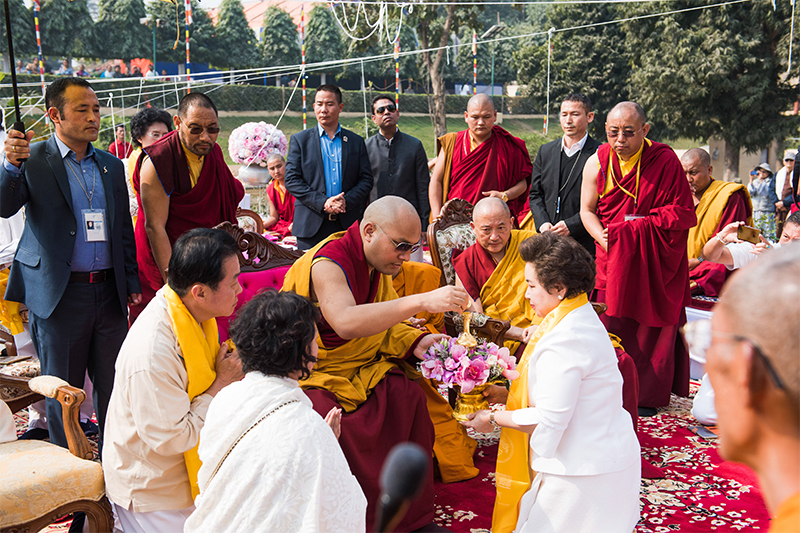 ཕྱི་ལོ་ ༢༠༡༧ ཟླ་ ༢ ཚེས་ ༡༩ བཀའ་བརྒྱུད་སྨོན་ལམ་ཐེངས་སོ་བཞི་པའི་ཉིན་མཐའ་མར། ཐ་ཡི་ལེཎྜ་ནས་གོ་སྒྲིག་བྱས་པའི་མཆོད་རྟེན་རིན་པོ་ཆེའི་གཙང་བཟོ་དང་ལྟ་སྐྱོང་ཚོགས་པས་དཔལ་༸རྒྱལ་དབང་ཀརྨ་པ་མཆོག་དང་། སྐྱབས་རྗེ་རྒྱལ་བའི་རྒྱལ་ཚབ་རིན་པོ་ཆེ་རྣམ་གཉིས་ལ། མཆོད་རྟེན་རིན་པོ་ཆེའི་གཙང་བཟོ་དང་ལྟ་སྐྱོང་ཚོགས་པ་འགོ་བཙུགས་མཛད་ནས་ལོ་ངོ་གསུམ་དུ་འཁོར་བའི་མཛད་སྒོ་ཆེན་མོར་ཕེབས་དགོས་པར་ཇི་ལྟར་གསོལ་བ་འདེབས་པ་བཞིན། ༸རྒྱལ་མཆོག་ཡབ་སྲས་རྣམ་གཉིས་དང་དགེ་འདུན་བཅུ་ཕྲག་འགའ་སྔ་དྲོ་ཆུ་ཚོད་བཅུ་པའི་ཐོག་བཞུགས་མཚེར་གཏེར་སྒར་དགོན་ནས་མཆོད་རྟེན་རིན་པོར་ཆིབས་སྒྱུར་བསྐྱངས། ཡབ་སྲས་རྣམ་གཉིས་མཆོད་རྟེན་རིན་པོ་ཆེའི་ནུབ་པྱོགས་སུ་གཞུང་ལམ་ནས་ཆིབས་འཕྲུལ་ལས་ཤོལ་རྟིང་ཐ་ཡི་ལེཎྜ་གྱི་ཚན་རིག་དང་འཕྲུལ་རིག་བློན་ཆེན་ ( Atchaka Sribunrunt )དང་། ཐ་ཡི་ལེཎྜ་རྒྱལ་ཁབ་རང་ནས་ཕེབས་པའི་གནས་བརྟན་སྡེ་པའི་དགེ་སློང་བཅུ་ཕྲག་ལས་བརྒལ་བ་རྣམས་དང་། དེ་བཞིན་ཚོགས་པ་དེའི་ཚོགས་མི་གནད་ཡོད་རྣམས་ཀྱིས་རྒྱལ་ཁབ་དེ་ཉིད་ཀྱི་ལམ་སྲོལ་བཞིན་མཛེས་ཤིང་ཡིད་དུ་འོང་བའི་མེེ་ཏོག་སྣ་ཚོགས་པ་མཆོད་པའི་སྒོ་ནས་ཤར་གྱི་རྒྱལ་སྒོ་ཆེན་པོ་ནས་བརྒྱུད་མཆོད་རྟེན་རིན་པོ་ཆེའི་ནང་གི་ལྷོ་ཕྱོགས། མཛད་སྒོ་ཆེན་པོ་དེའི་ས་གནས་གོ་སྒྲིག་བྱས་པ་དེར་རིམ་གྱིས་གདན་དྲངས་པར་མཛད། ཡབ་སྲས་རྣམ་གཉིས་ཞབས་པད་འཁོད་མ་ཐག་འདུས་པ་ཀུན་ལག་ཐལ་སྦྱར་དང་བཅས་ཡར་ལངས་ནས་དགའ་མགུ་ཆེན་པོས་རབ་ཏུ་གུས་ཤིང་བཏུད་པར་བྱས། དེ་ནས་ཚོགས་མི་ཞིག་གིས་དཔལ་༸རྒྱལ་དབང་ཀརྨ་པ་མཆོག་དང་སྐྱབས་རྗེ་རྒྱལ་བའི་རྒྱལ་ཚབ་ཆེན་པོ་རྣམ་གཉིས་ཕེབས་པ་ལ་དགའ་བསུ་དང་འབྲེལ་ཐུགས་རྗེ་ལེགས་འབུལ་གྱི་གཏམ་བཤད་མདོར་བསྡུས་ཞིག་བྱས། དེ་རྗེས་ཐ་ཡི་ལེཎྜ་གྱི་ཚན་རིག་དང་འཕྲུལ་རིག་བློན་ཆེན་དེ་ཉིད་དང་ཚོགས་པ་དེ་ཉིད་ཀྱི་སྦྱིན་བདག་གནད་ཡོད་རྣམས་ནས་ཡབ་སྲས་རྣམ་གཉིས་ལ་བོད་ཀྱི་ལམ་ལུགས་བཞིན་ལག་ཏུ་བཀྲ་ཤིས་པའི་ལྷ་དར་ཐོགས་ནས་རིམ་བཞིན་མཇལ་ཁ་དང་བཅས་བྱིན་རླབས་ཞུས་ཏེ་ལྷན་ཅིག་ཏུ་སྐུ་པར་སྒྲོན། དེ་ནས་མཛད་སྒོའི་ས་གནས་དེའི་ལྷོ་ཕྱོགས་སུ་༸རྒྱལ་མཆོག་ཡབ་སྲས་རྣམ་གཉིས་དང་ཐ་ཡི་ལཎྜ་གྱི་ཚན་རིག་དང་འཕྲུལ་རིག་བློན་ཆེན་དབུས་ཚོགས་མི་གནད་ཡོད་རྣམས་དང་། བྱང་ཕྱོགས་སུ་གནས་བརྟན་སྡེ་པའི་དགེ་སློང་བཅུ་ཙམ་དང་། ནུབ་ཕྱོགས་སུ་གཞི་ཐམས་ཅད་ཡོད་པར་སྨྲ་བའི་སྡེ་པའམ་བོད་ཀྱི་དགེ་འདུན་པ་བཅུ་ལྷག་ནས་རང་རང་ལུགས་ཀྱི་ཞལ་འདོན་དབྱངས་རྟ་སྙན་མོས་དུས་ཡུན་སྐར་མ་བཙུ་ཙམ་ཞིག་འདོན་པར་མཛད། མཇུག་ཏུ་ཐ་ཡི་ལེཎྜ་གྱི་བློན་ཆེན་མཆོག་ནས་རྒྱལ་མཆོག་ཡབ་སྲས་རྣམ་གཉིས་ལ་སྟོན་པ་བཅོམ་ལྡན་འདས་ཀྱི་སྐུ་བརྙན་ཆུ་ཤེལ་ལས་གྲ
