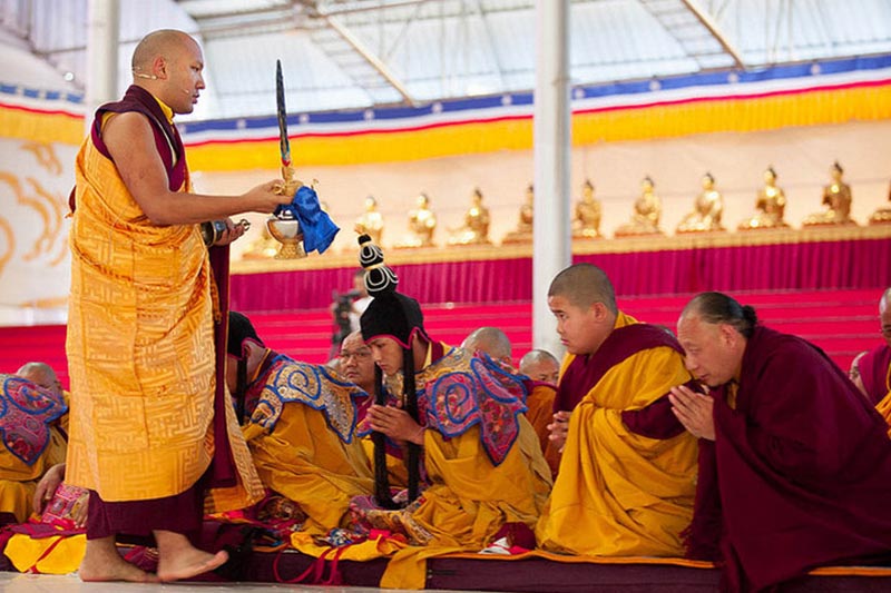 2:10法王在法號前導下入場,陞法座。接著,由嘉察仁波切、明就仁波切等傳承主要祖古仁波切向法王敬獻曼達。