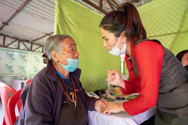 在西醫診間裡,醫生和護士為患者量血壓,進行糖尿病和B型肝炎的篩檢。接著,患者拿著醫生所開立的藥方,到隔壁帳棚的藥局免費領取藥物。法會休息時間是就診尖峰,看診的帳棚外,很快便大排長龍。前來就診的患者除了噶舉寺院的僧眾和居士之外,還包括身穿橘色僧袍的印度行者,以及菩提迦耶的當地居民。